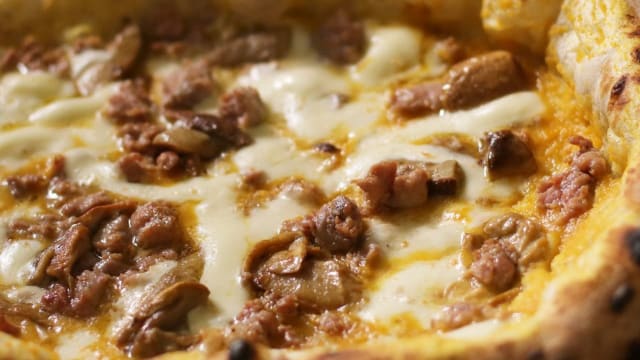 Mozzarella di bufala, salsiccia maialino nero, funghi porcini, fonduta di parmigiano reggiano dop, basilico, olio extravergine di oliva oro di caiazzo.