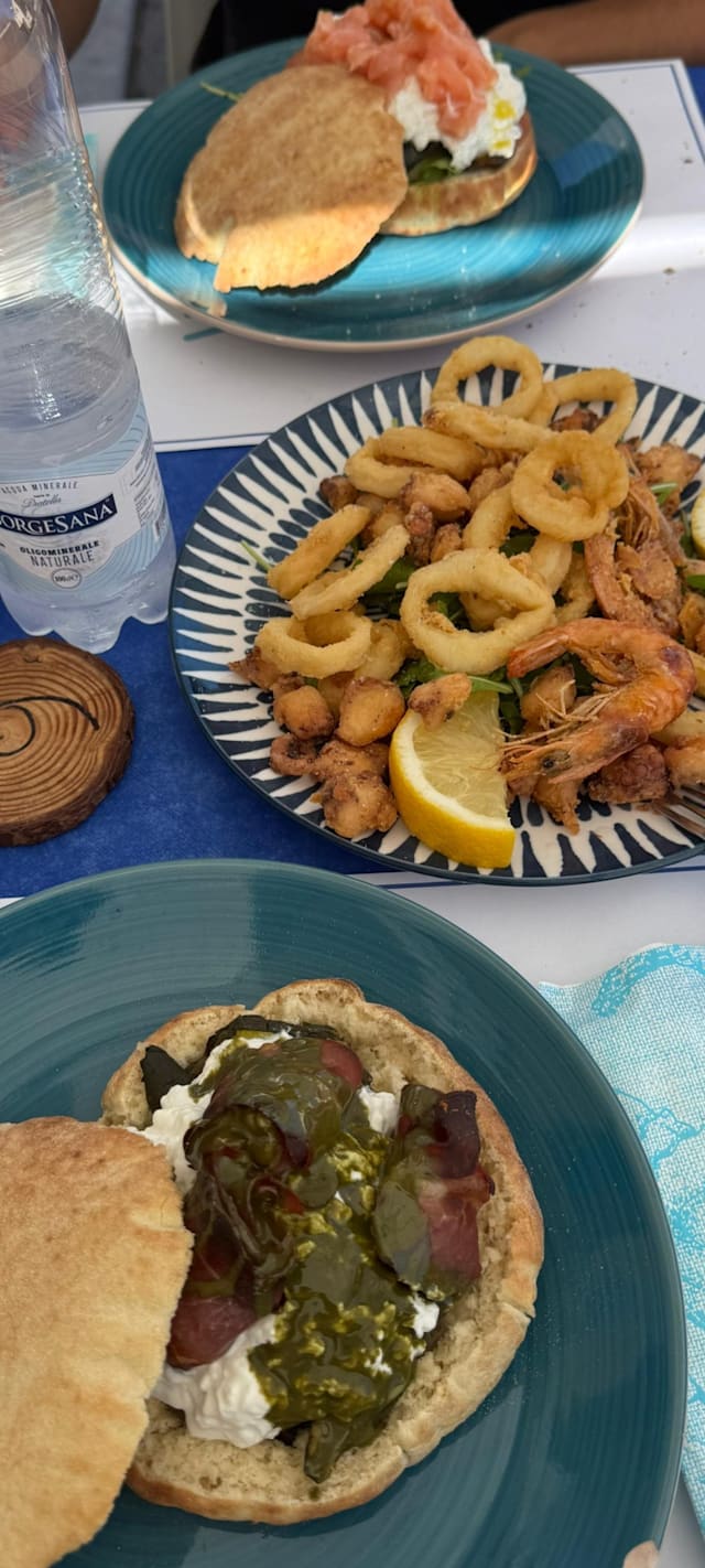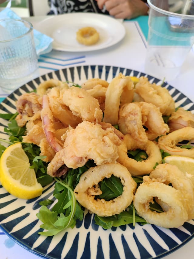Puccia marinese, calamaro fritto, rape e salsa di cipolla di tropea