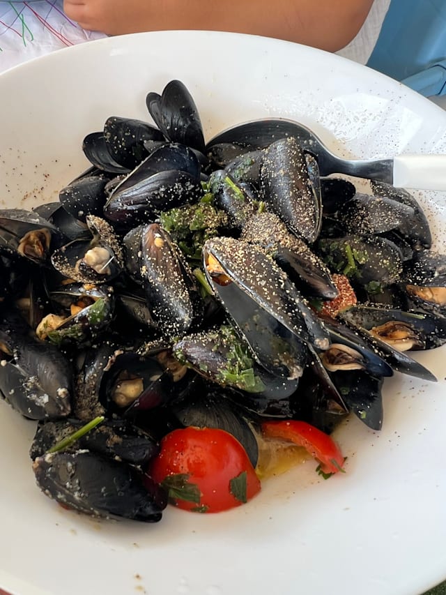 Puccia marinese, cozze fritte, mortadella, provola e pesto di pistacchio