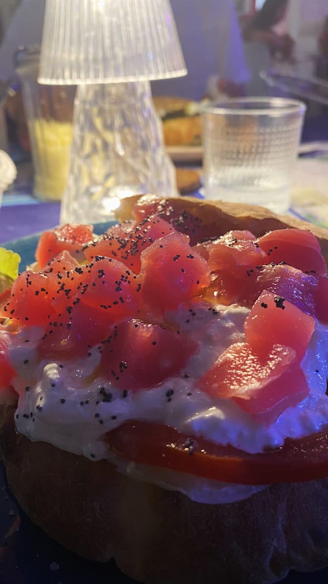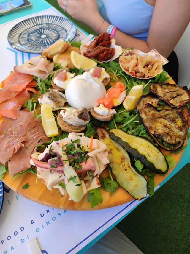 Puccia marinese, tartare di salmone, stracciatella, pomodoro, rucola e zucchine grigliate