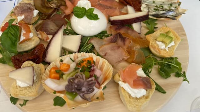 Puccia marinese, gamberone roll, speck, zucchina grigliata, stracciatella e pesto di pistacchio