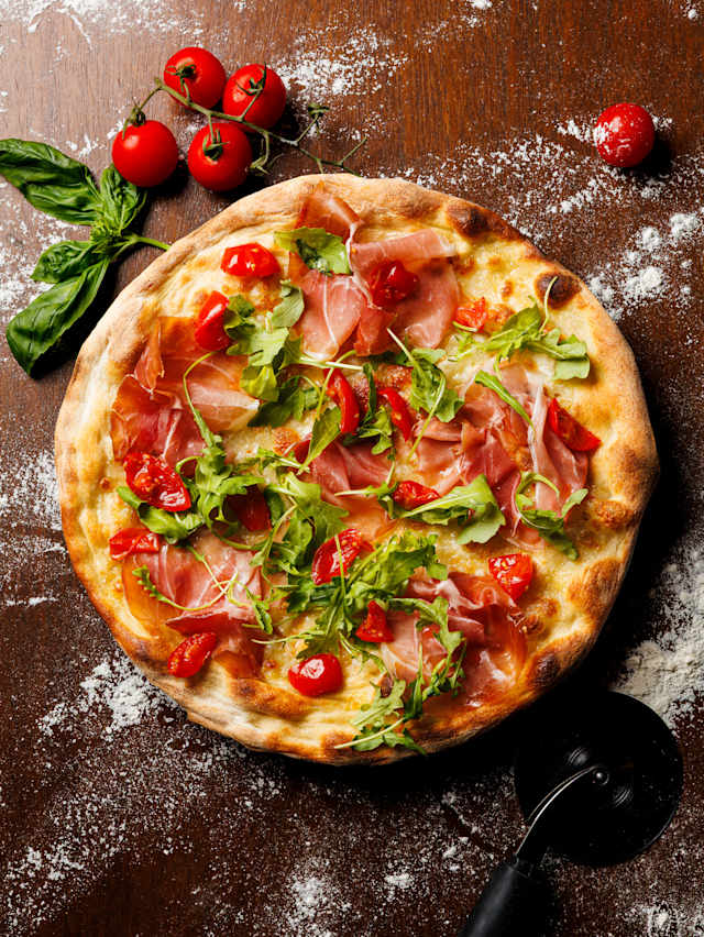- Pomodoro san marzano, mozzarella fior di latte pugliese, prosciutto cotto, funghi freschi, carciofi sott'olio, olive verdi, basilico, olio evo