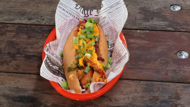 Fresh fries with cajun-herbs | Sour cream | Jalapeño relish | Mexican taco beef | American cheddar cheese sauce | Spring onions