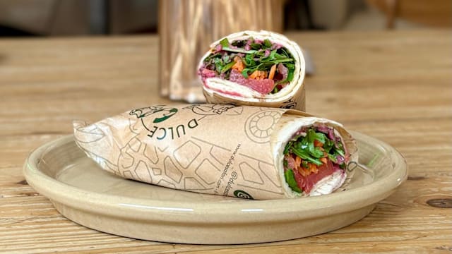 - (Salmón marinado, hummus de remolacha en tortilla de trigo, con aguacate, zanahoria, rúcula y queso crema acompañado de patatas chips)