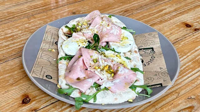 - (Mortadela italiana, queso parmesano, pistacho 100% ibérico, rúcula, mozzarella y un toque de miel de trufa)
