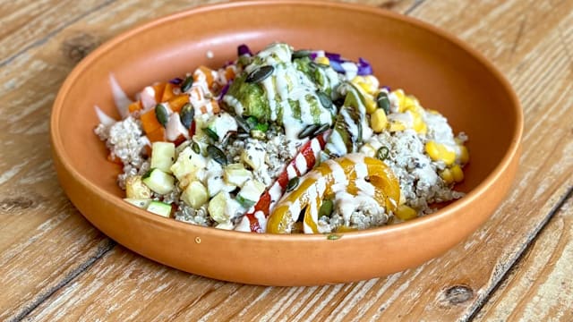 - (Boniato, pimientos, calabacín, lombarda, aguacate, garbanzos cocidos y semillas de calabaza, aderezado con una salsa de tahini y cacahuete.)