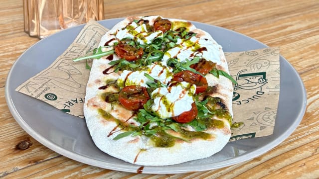 - Tomates confitados y cremosa burrata, coronada con pesto de pistacho y rúcula