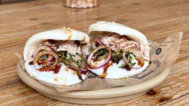 - Pulled pork cocinado a fuego lento con salsa barbacoa, combinado con ensalada de coleslaw y un toque de sésamo tostado.