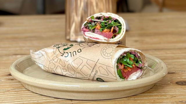 - Salmón marinado, hummus de remolacha untado en tortilla de trigo, con aguacate cremoso, zanahoria crujiente, rúcula y queso crema