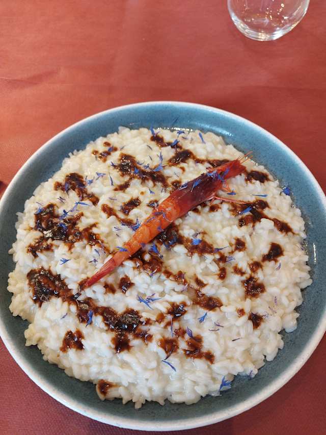 - Risotto al fiordaliso, gambero viola crudo e fondo di gambero al pompelmo