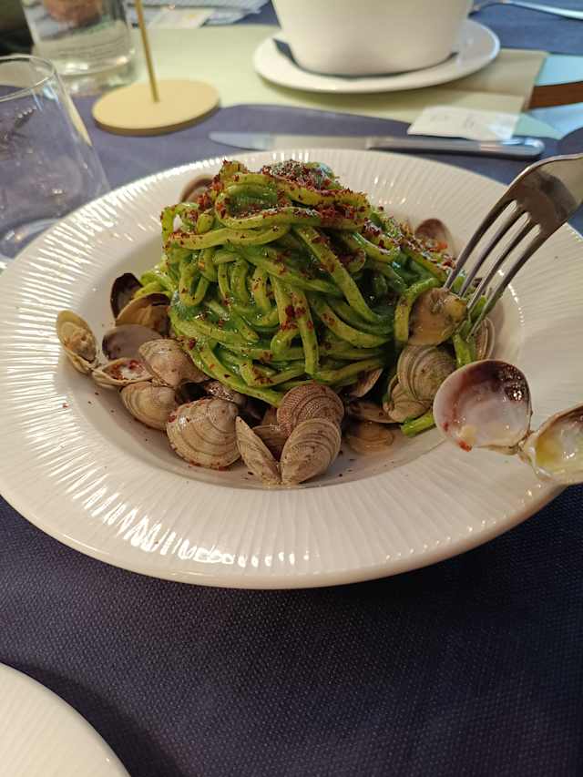 - Tonnarelli affumicati, vongole lupini, crema di cime di rapa e peperone crusco