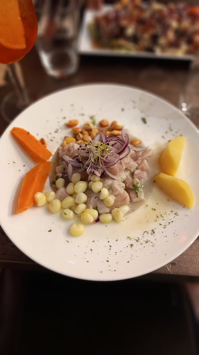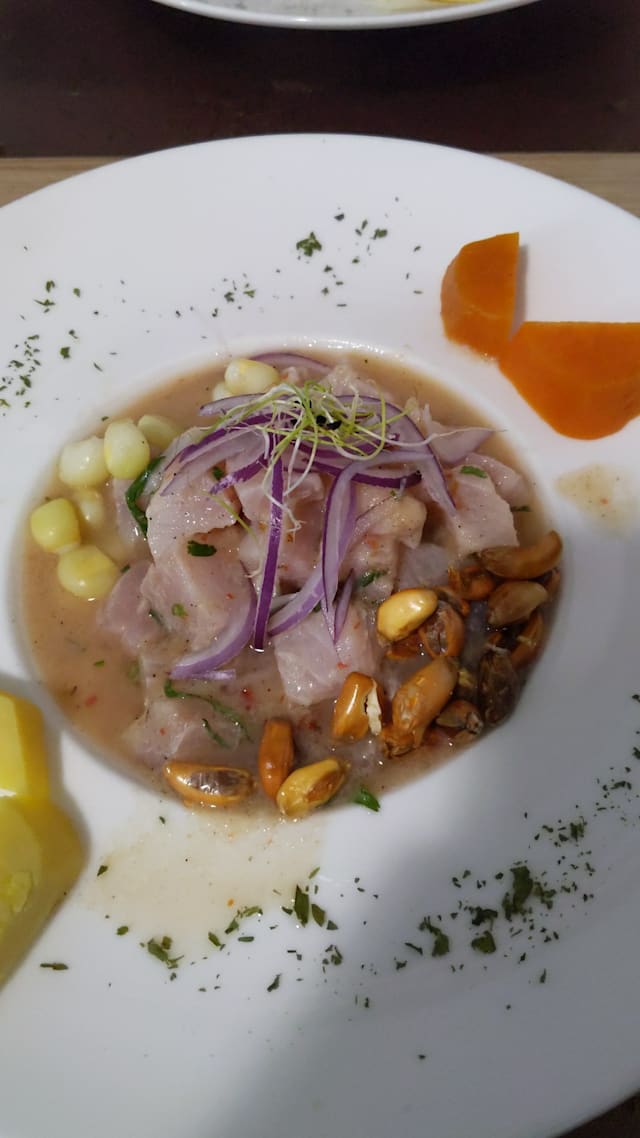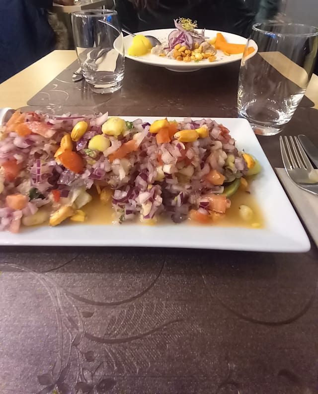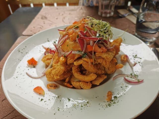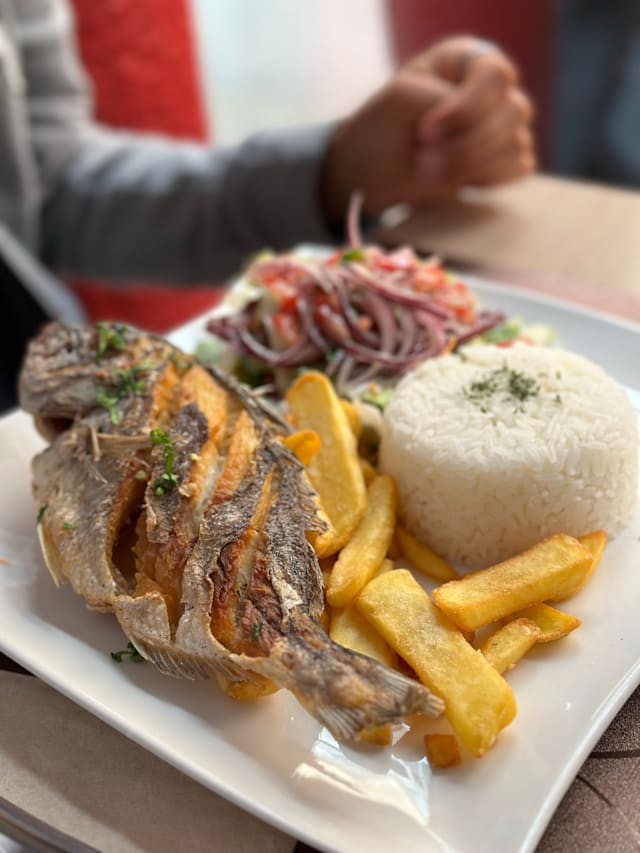 Consists of a variety of seafood such as fish, squid, and shrimp, which are lightly breaded and deep-fried until crispy, and it is served with salsa criolla (a mixture of onions, tomatoes, and lime juice) and fried yucca .