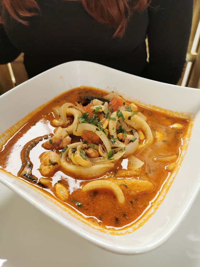 Riz cuit avec un mélange de fruits de mer comme les crevettes, les calmars et les moules, agrémenté d'oignons, d'ail, de poivrons et de coriandre.