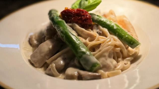 Peito de frango, massa linguine, cogumelos frescos, espargos e molho de natas com queijo grana padano