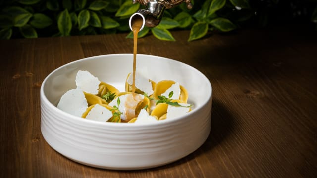 RAVIOLO DEL PLIN RIPIENO DI CONIGLIO ALLA BRESCIANA, AMARO DEL FARMACISTA E SALSA SOUBISE