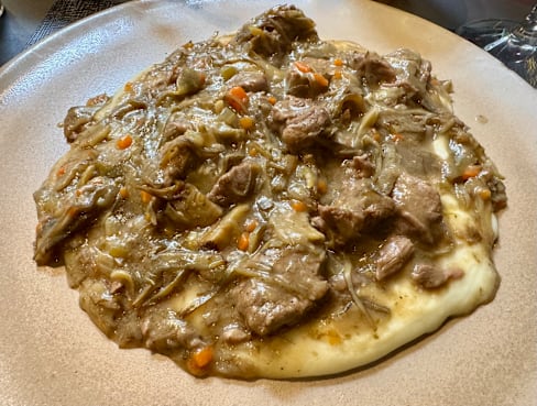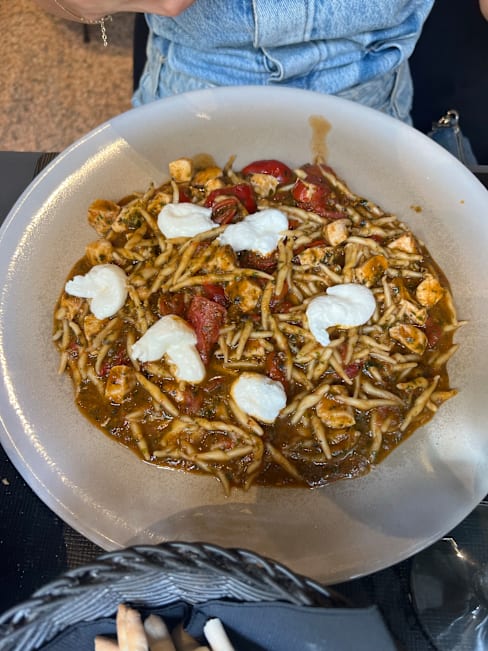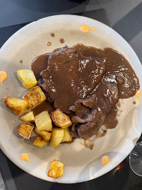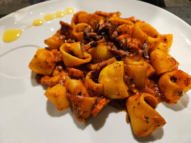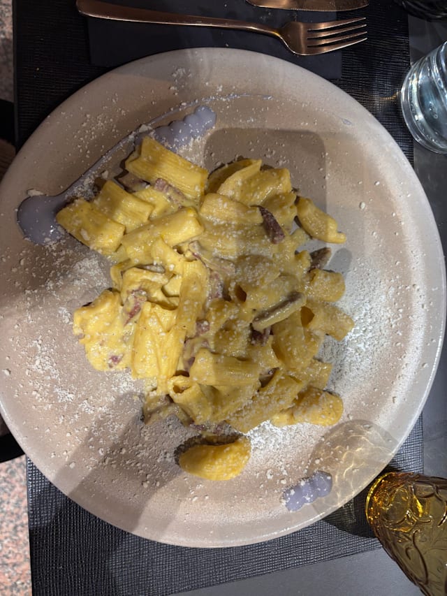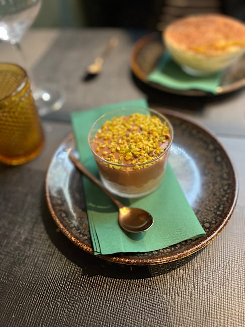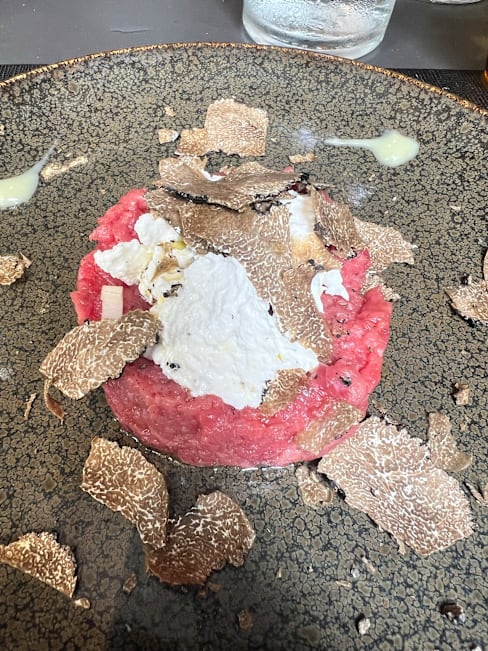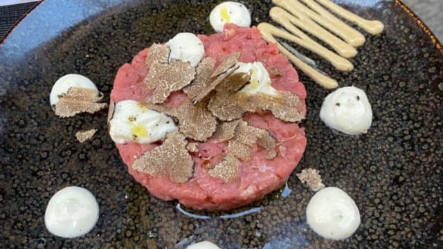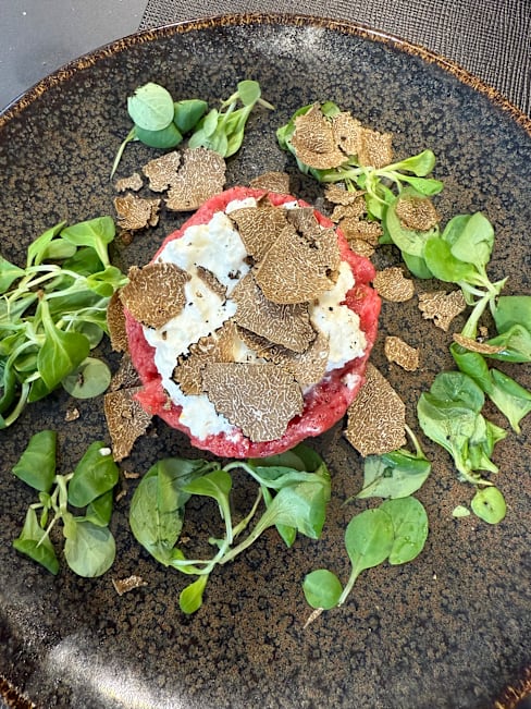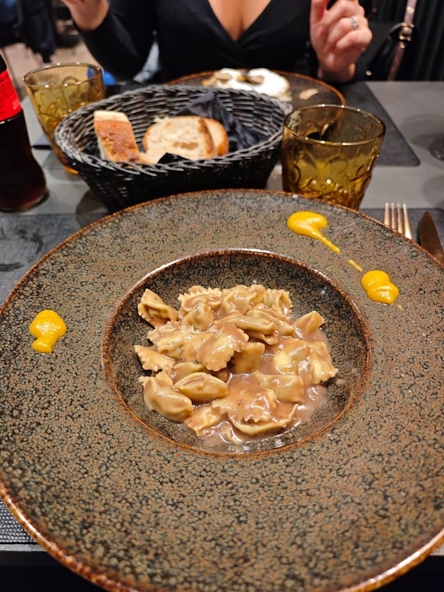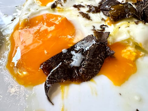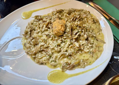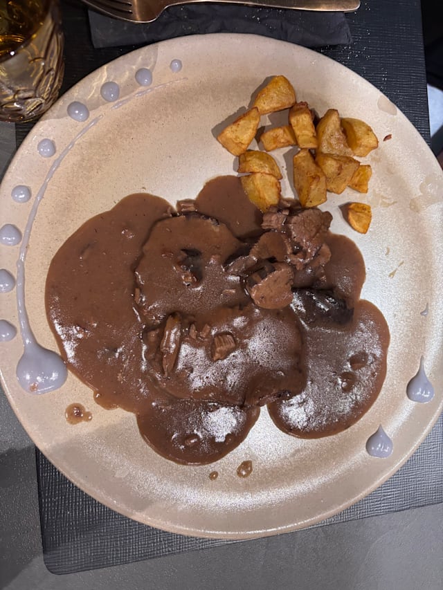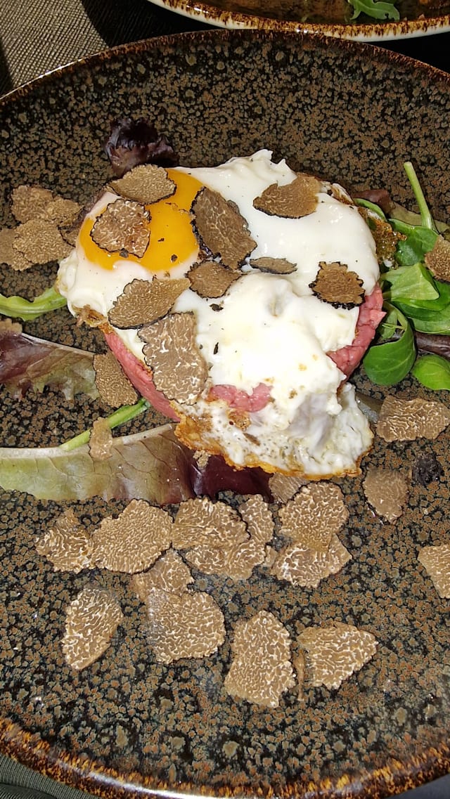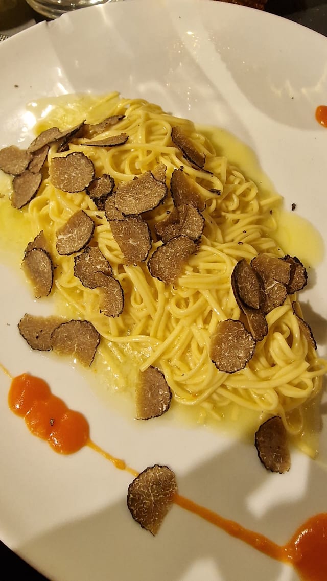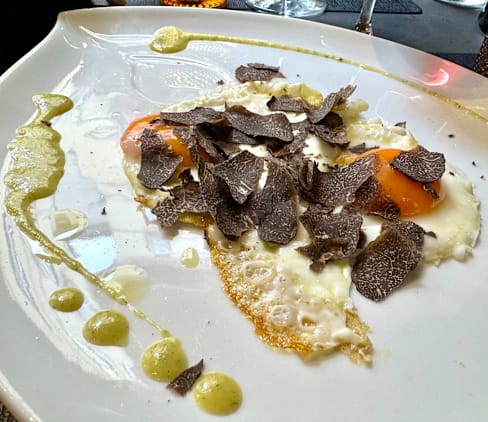 10/10+1In mid-March my sweetheart and I went to a new (for us ) restaurant, Duomo Bistrot “Le vie del sale. As soon as my wife and I stepped inside it felt like a great choice, being greeted with a smile by the host (not something done at every restaurant). The place looks stylish, modern in decor but with historic brick walls. The menu had a lot of nice selections, including many dishes featuring black truffles — so for the opener I selected the dish with egg served sunny-side up topped with truffles. I was pleased that the dish came with two eggs and a generous amount of truffle slivers covering them. For her main dish my wife chose a risotto with artichoke that she found very pleasing and tasty. My choice was the spezzatino (stew) of Fassone beef made with artichokes and served over a bed of potato purée. Delightful, tender and flavorful. A couple of nice caffès topped off the lunch, with a nice farewell chat with the host Nick. Definitely a restaurant worth visiting again.