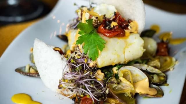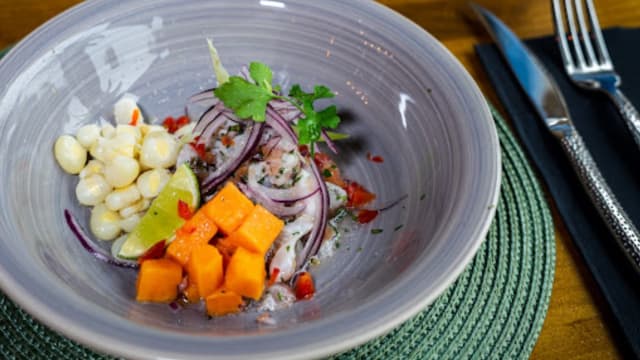 - Corvina, leche de tigre, boniato caramelizado, maíz choclo, maíz crujiente, cebolla morada y cilantro