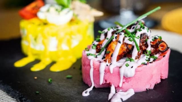- Patata con ají amarillo, atún salteado al panka, picada criolla, aguacate y salsa de aceitunas