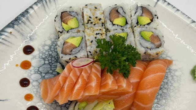 (4 pers: 4 salade, 4 soupe) 6 maki saumon, 6 printemps saumon, 6 california saumon avocat, 8 roll saumon fromage, 8 saumon roll avocat fromage, 2 temaki saumon avocat, 2 temaki surimi avocat, 16 sushi variés, 20 sashimi assortis, 4 brochettes de saint-jacques, 4 brochettes de crevettes