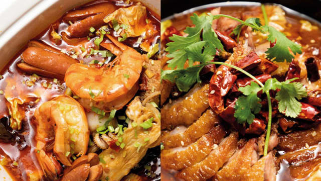 Chengdu spicy steam pot with intestines, tripe, mini sausages, prawns, and vegetables