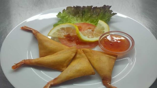 Feuilles de farine de riz, crevettes marinées sauce huître, huile de sésame, sel, sucre, poivre noir.