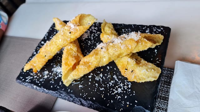 Wonton de camarão crocante, servido com molho caseiro tailandês de pimentão doce.
