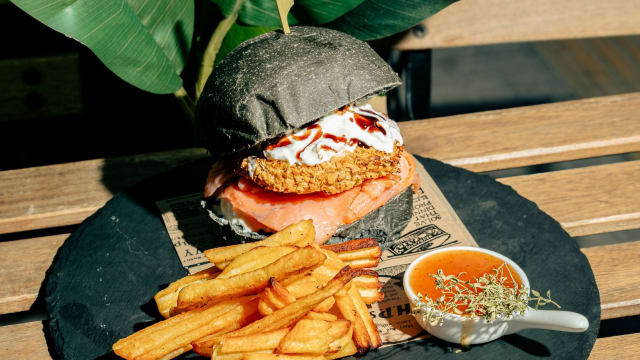 - Buns al carbone, salmone affumicato norvegese, stracciatella, rucola, cetriolo, basilico e contorno di patate
