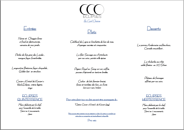 10/10Dinner was magnifique! Every course was inventive, unique, beautifully presented, and absolutely delicious! The setting is beautiful and the wait staff are true professionals. We have enjoyed many lovely (and Michelin star-rated) restaurants while in France these last two weeks; however none compare to ECLIPSES by Cyril Choisne. Unparalleled and we are very happy to have enjoyed this experience.