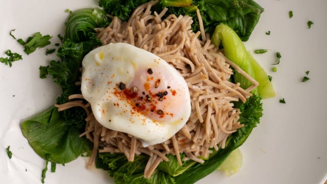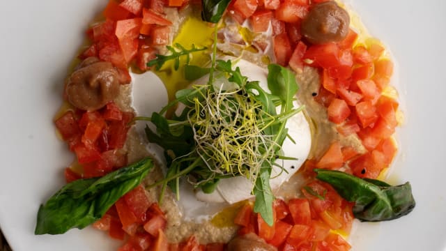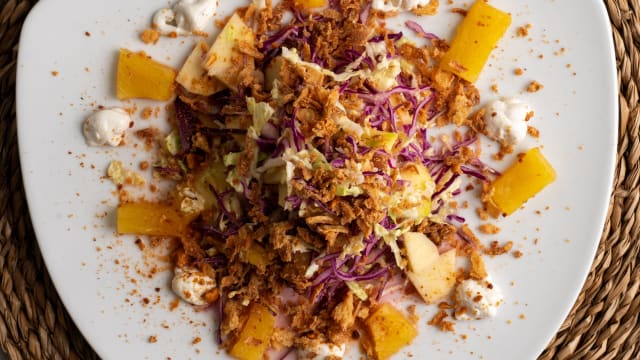 Albóndigas de Jackfruit con Arroz Negro, Boletus, Semillas de Calabaza y Espinaca€11.5Arroz negro, sémola de arroz, semillas de calabaza, ajo, perejil, espinaca, uvas pasas, cebolla, jackfruit, pan sin gluten, harina de garbanzo, leche de soja, guindilla, zanahoria, tomate y germinados finos