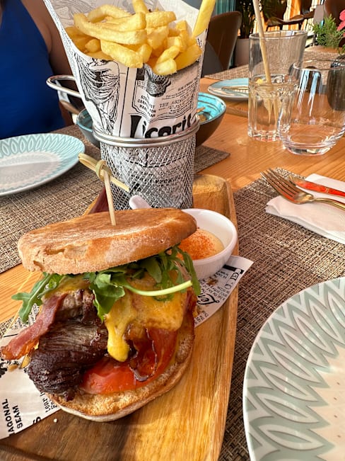 8.5/10We were in Lagos so the restaurant was about a 25 minute drive. It was empty when we arrived. We sat outside which was nice though smokers were on the patio. I had the steak sandwich. The bread was crunchy and the steak was a little tough, but the taste was great. Generous pour on the wine. My husband had the shrimp which he liked. The lattes were great. Nice midday meal. Our waitress was good but seemed to forget about us at the end. Maybe we were supposed to know to go inside to pay. There was a miniature golf course just below the balcony so it’s a great place to bring kids.