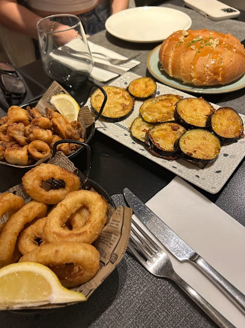 9/10nice cozy spot open late. we were late for our reservation which wasn’t needed as only 4 other tables occupied at our late arrival. had to wait a bit to order but server was very nice and spoke english well. the food was very good but we thought a bit overpriced. skewer of pork very tender and delish sauce to accompany but expected it to come with a veg or salad for 22€. lamb and rice tasty but also on the pricier side. eggplant appy good too but surprised it was cold. side of bread wasn’t anything special. cava by the glass a bit on the sweeter side. wine recommendation from monsant was delish. overall 1 appy, 2 mains, 2 glasses of cava, water and a bottle of wine for 117€. not a great value. not sure if they still have a menu del dia as i saw a pic of it but would go back for that for sure