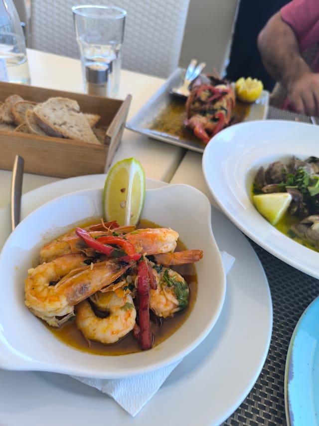 9.5/10We have visited before over the years. Now there is a new look , new staff, new menu. It’s a winner for location. Right next to the beautiful sea and just right for sunset. Garlicky prawns yummy to share. We chose then to share a sea bass. It was delicious. Too full for dessert! A much enjoyed evening.