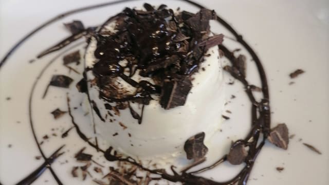 Su crema alla vaniglia, con amarene sciroppate e cioccolato fondente fuso