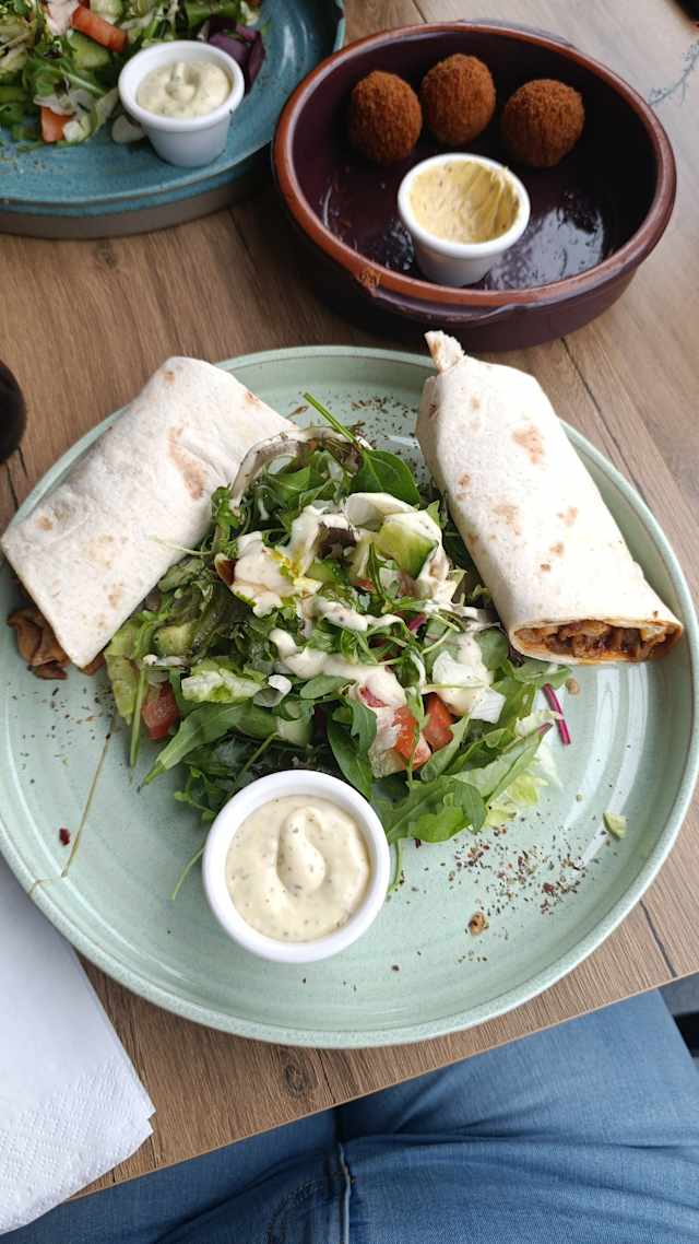 - Gekruid gehakt in een wrap overgoten met tomaten en yoghurtknoflooksaus
