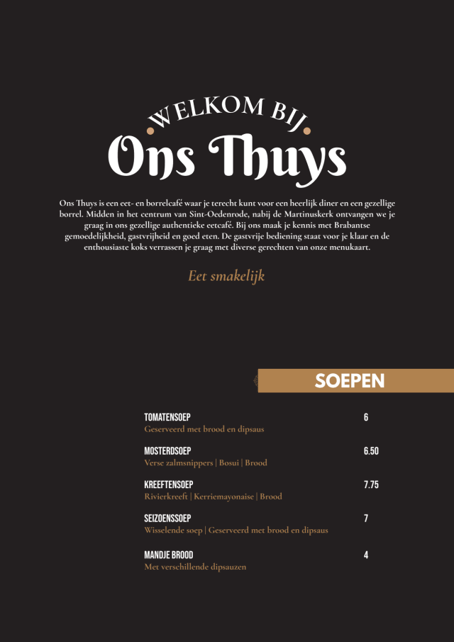 Ons Thuys is een eet- en borrelcafé waar je terecht kunt voor een heerlijk diner en een gezellige borrel. Midden in het centrum van Sint-Oedenrode, nabij de Martinuskerk ontvangen we je graag in ons gezellige authentieke eetcafé. Bij ons maak je kennis met Brabantse gemoedelijkheid, gastvrijheid en ...
