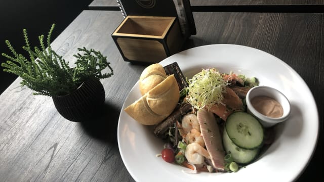 Biefstuk (200 gr.) / gepelde gamba's / knoflook (de vleesgerechten worden geserveerd met salade en u kunt kiezen uit verse frites of "steppegras")