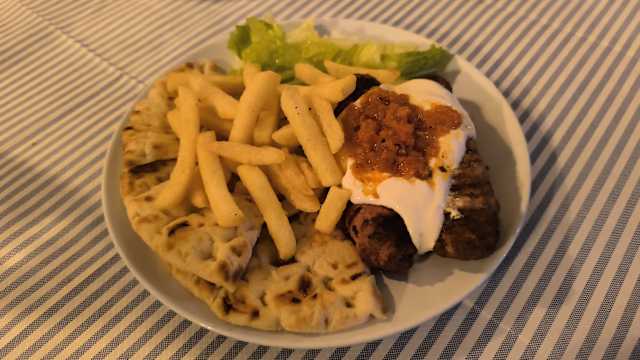 - Hamburger vegetariano con pita, tzatziki, insalata e patate