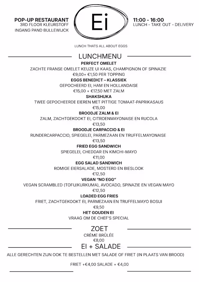From perfectly soft-boiled to golden scrambled, from classic eggs benedict to creative egg-inspired dishes — we celebrate the most versatile ingredient in the world at our cozy pop-up at Kleurstoff events in Amsterdam South - East.