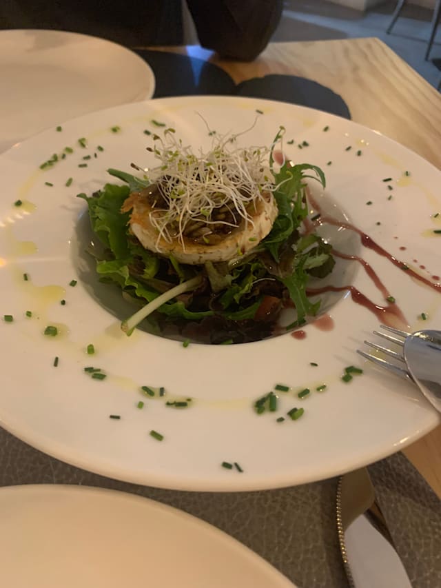 Ensalada de queso de cabra, sobre picadillo de tomate y vinagreta de frutos secos