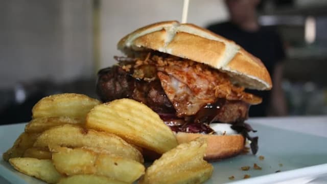Hamburguesa de ternera de 200gr en pan artesano, lechuga, cebolla roja, queso cheddar, bacon, salsa barbacoa y pull pork.