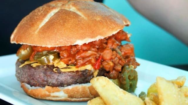 Hamburguesa de ternera de 200gr en pan artesano, chile con carne, jalapeños y queso cheddar.