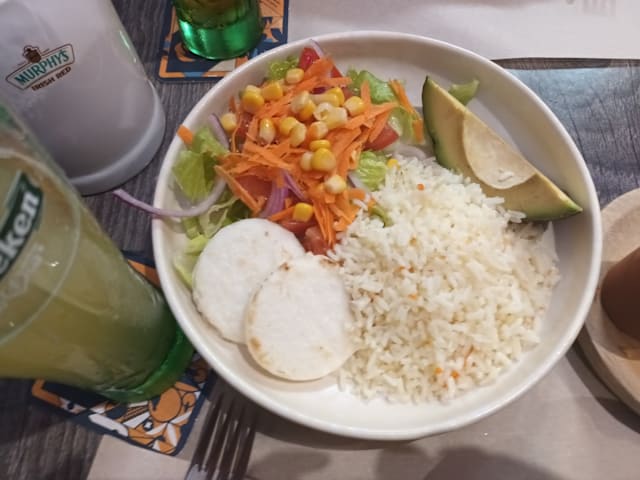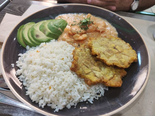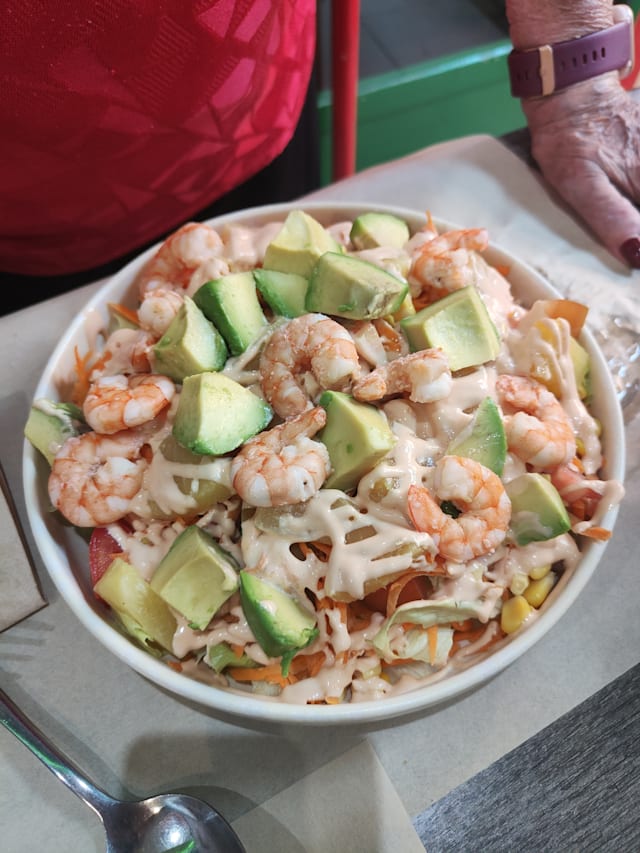 Langostinos con salsa rosita + aguacate, piña y maicitos