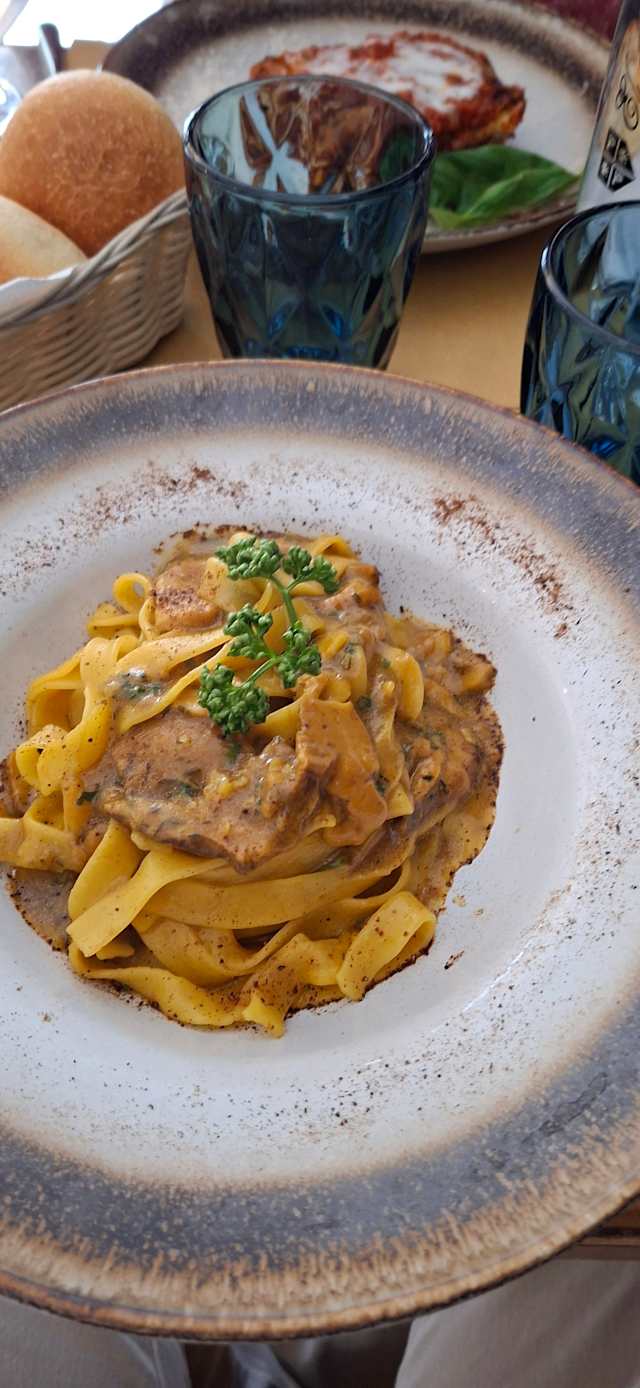 - Tagliolini al tartufo con crema di porcini e scaglie di formaggio