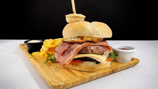 (pan, carne, beicon, huevo frito, jamón y queso)