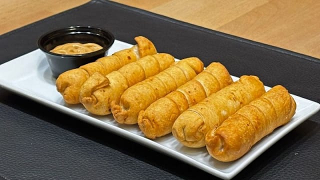 Aperitivo venezolano, combinación de queso fundido envuelto en una masa de harina de trigo frita y salsa de la casa