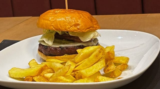 Hamburguesa deliciosa con carne de ternera, queso cheddar, lechuga iceberg, tomate, mayonesa y ketchup, acompañada de patatas caseras fritas, incluye bebida zumo de naranja.
