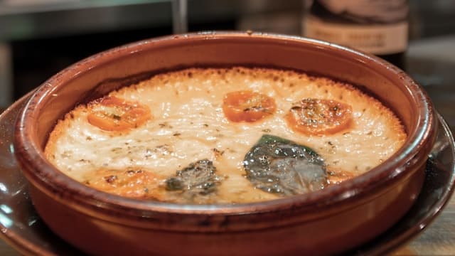 Nuestra mezcla de quesos, salsa de tomate el bodegón, rodajas de tomatey aliño de ajo y perejil.