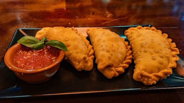 Rellena de carne de cerdo marinada a la cerveza negra, pimiento y cebolla.