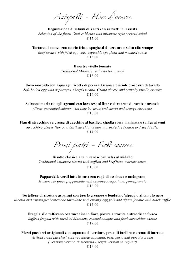 10/10the character and atmosphere were perfect for our group of 3 adults. Would not suggest for families with small children. The menu was classic Milenese with some modern touches. Service attentive without being obtrusive.
