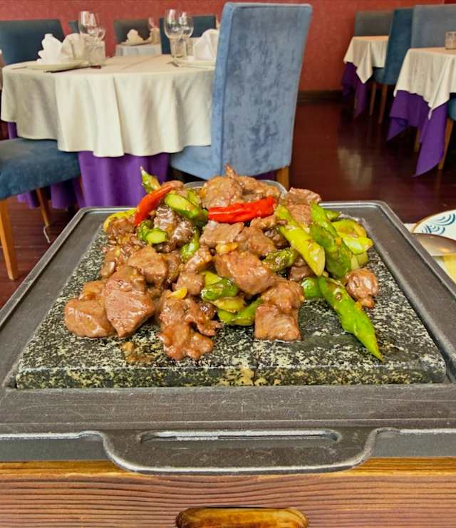 - Carne de volandeira con fideos de soja cubierta de cebollino.